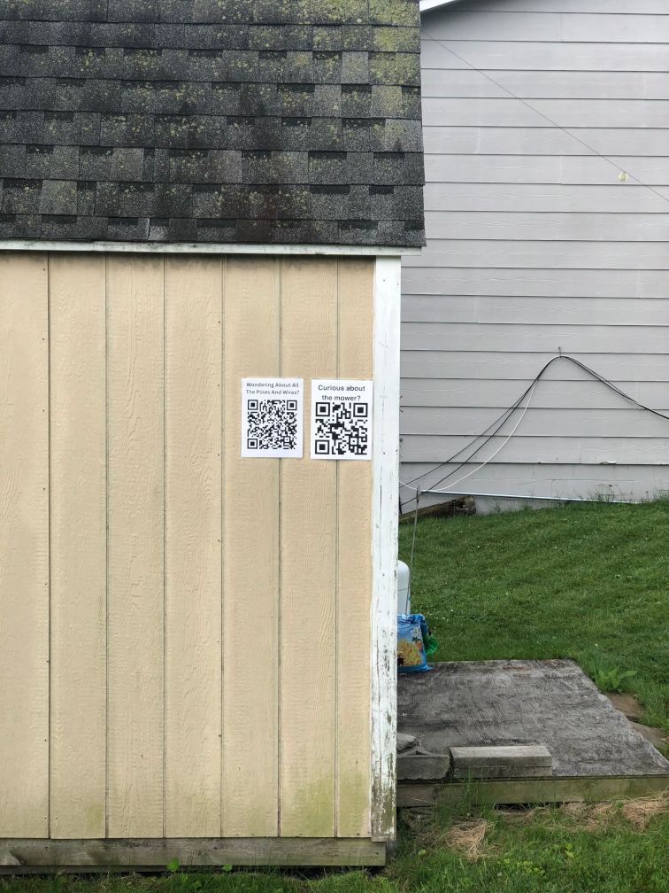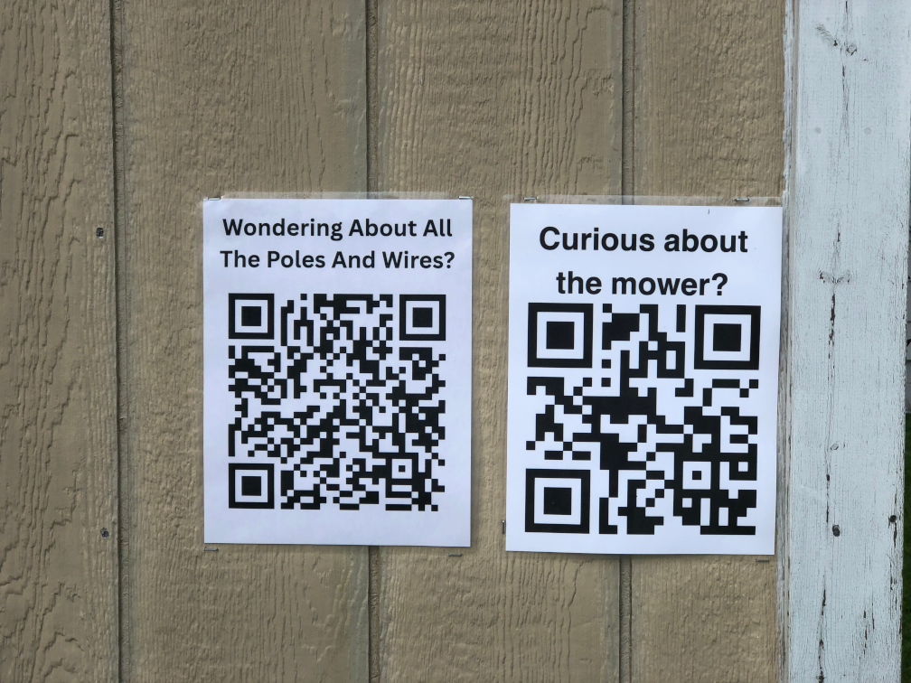 A pair of laminated 8.5x11" printouts of QR Codes, stapled to the outside wall of a wood building. The one on the left asks, "Wondering About All The Poles And Wires?" The other asks, "Curious about the mower?"